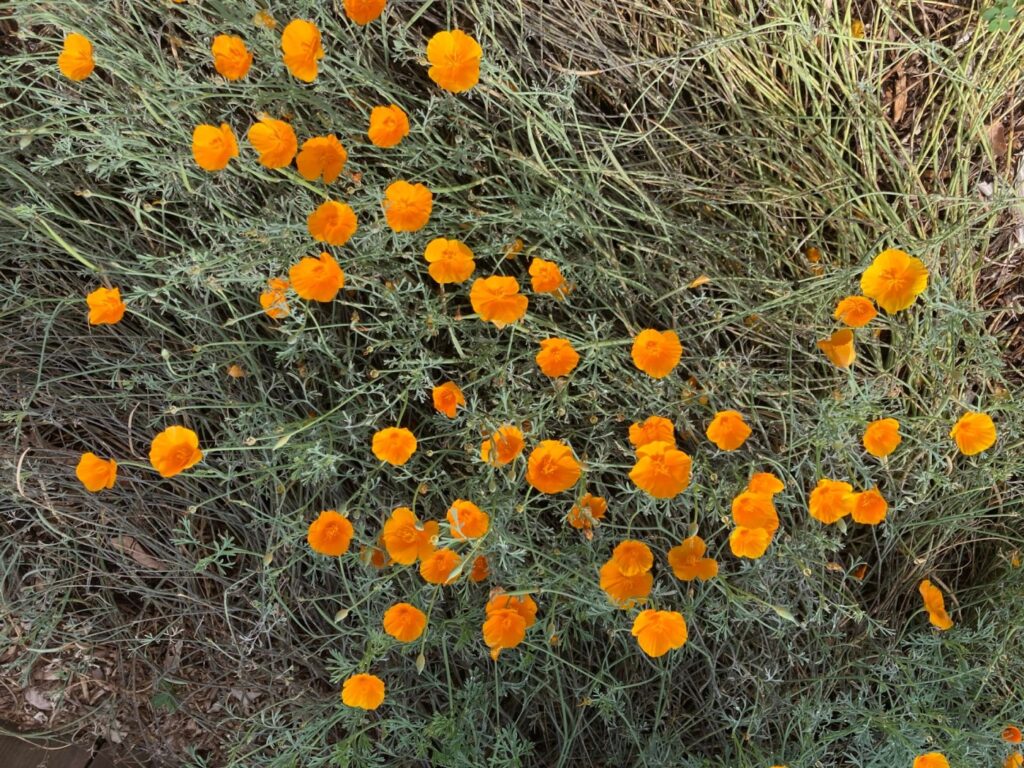 In my own San Fernando Valley backyard, I have a California poppy that has been flowering without interruption for more than six months. It currently has 100 flowers and shows no signs of slowing down. I do think that a number of factors have contributed to its non-stop flower show. First, it’s a volunteer. When a seed sprouts in a particular spot without being planted there by you or me, it is telling the world that it has found the right niche for reaching its full potential as a mature plant. Second, my poppy received the benefit of being watered a few minutes every other day throughout a summer which, in any case, was cooler than normal. Third, my plant has spread out like a mat, covering the ground so that roots are constantly shaded and cool. Fourth, the seed sprouted a few inches from a fence so its major roots have grown underneath woody planks, benefitting from the protection that they afford.
