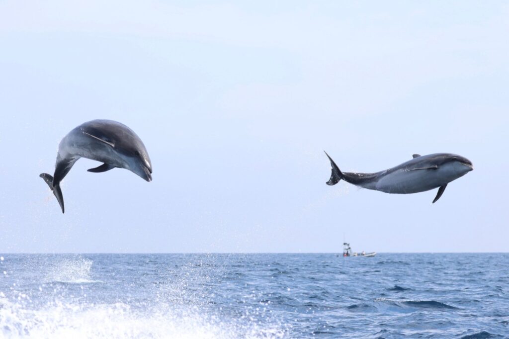 “This type of ‘high flying’ behavior is not commonly seen by bottlenose dolphins and demonstrates this species’ playful nature and strong social bonds,” said Jessica Rodriguez, education and communications manager for Newport Landing & Davey’s Locker Whale Watching.
